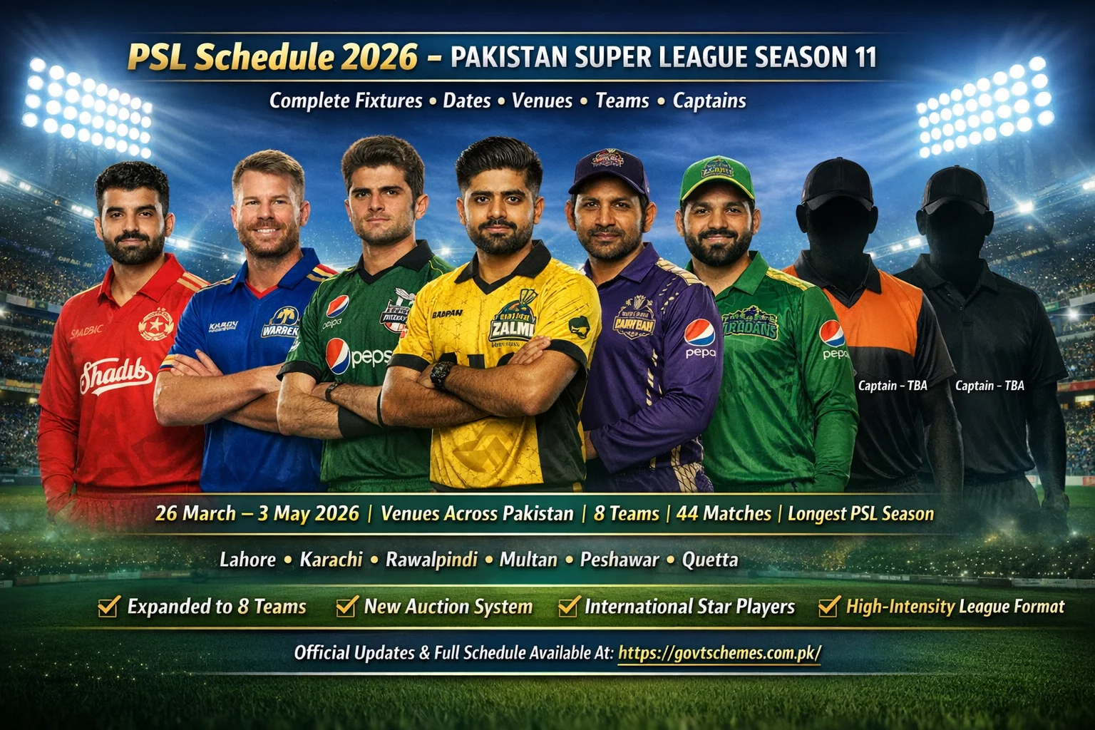 The PSL Schedule 2026 features 8 teams competing in 44 thrilling matches across Pakistan from 26 March 2026 to 3 May 2026. Stay updated with all match timings, venues, and fixtures.